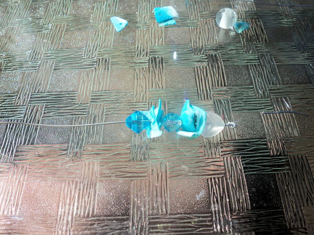 My choice of "beads". I liked the light blue with the cobalt blue of the bottle. I just grabbed some out of my stash, little colored shell chips (which will probably fade) and some glass beads. The wire, was a tad bit too soft, as I will later show.
