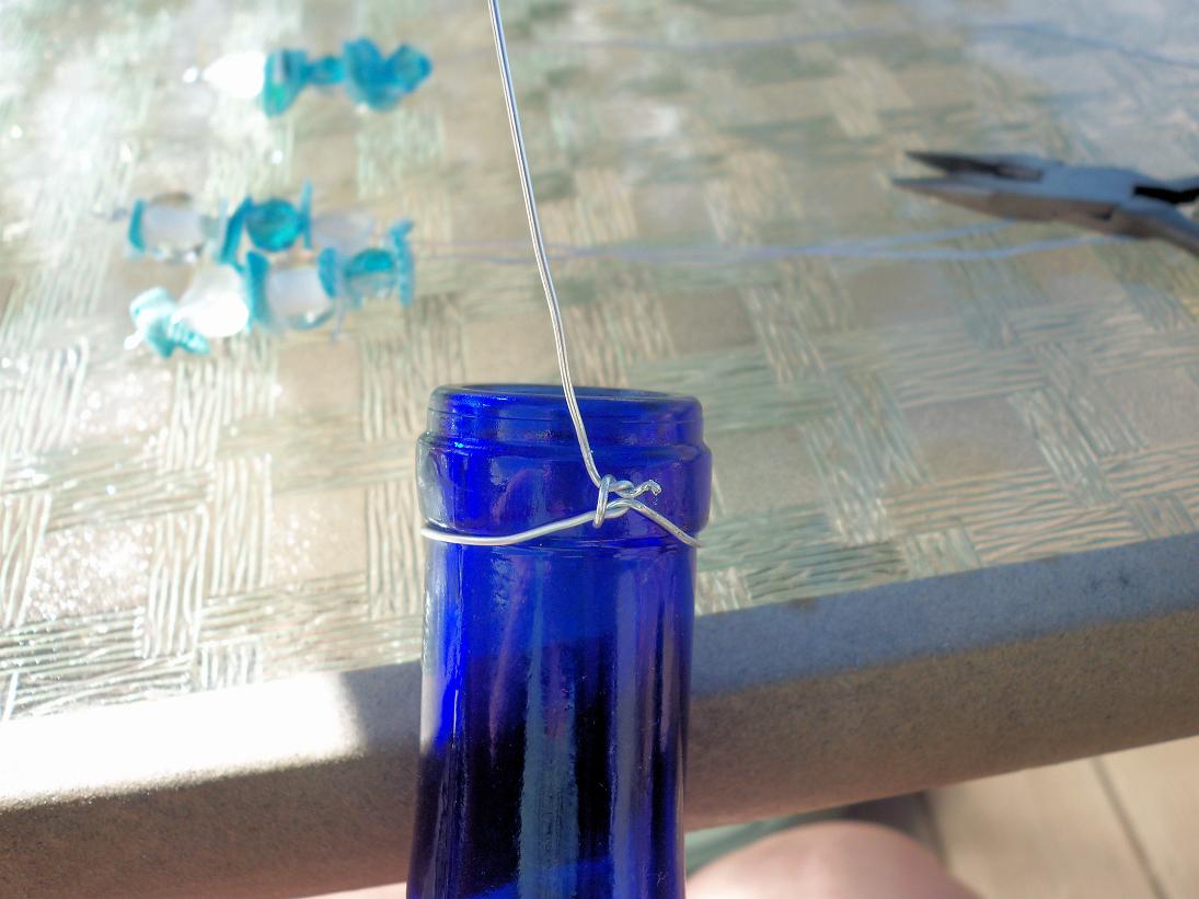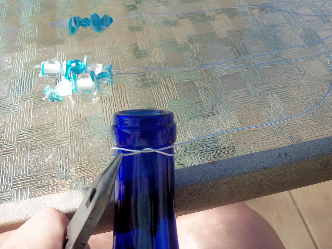 Take the end of the wire with the beads attached, and feed it through one of the wraps of wire on the neck of the bottle.