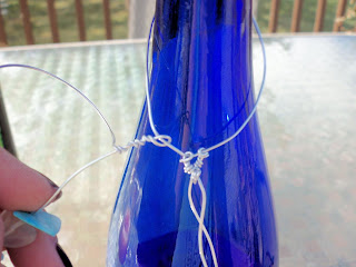 It may pull the wire loose a bit, but don't worry, you can tighten it up when you are done. When the beads hang on the bottle about where you want them, make a "u" out of the wire, then wrap the end around itself several times so it is attached to the neck wire (neck wire? sounds totally dangerous!!) You don't have to use all the end of the wire, just trim it off after you have wrapped it around 5 or 6 times.