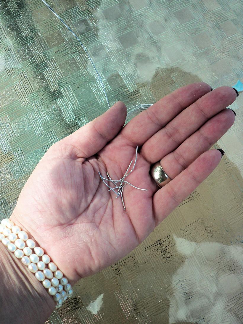 Cut around 3 pieces of wire about 9 inches long. You can do more or less, but since I am absolutely obsessed and OCD about odd numbers...go for odd numbers, and don't ever tell me if you do even! Tie a knot in the end of each wire, then gently tighten it up by grabbing one end with your hand, and the other with pliers and pulling it tight.